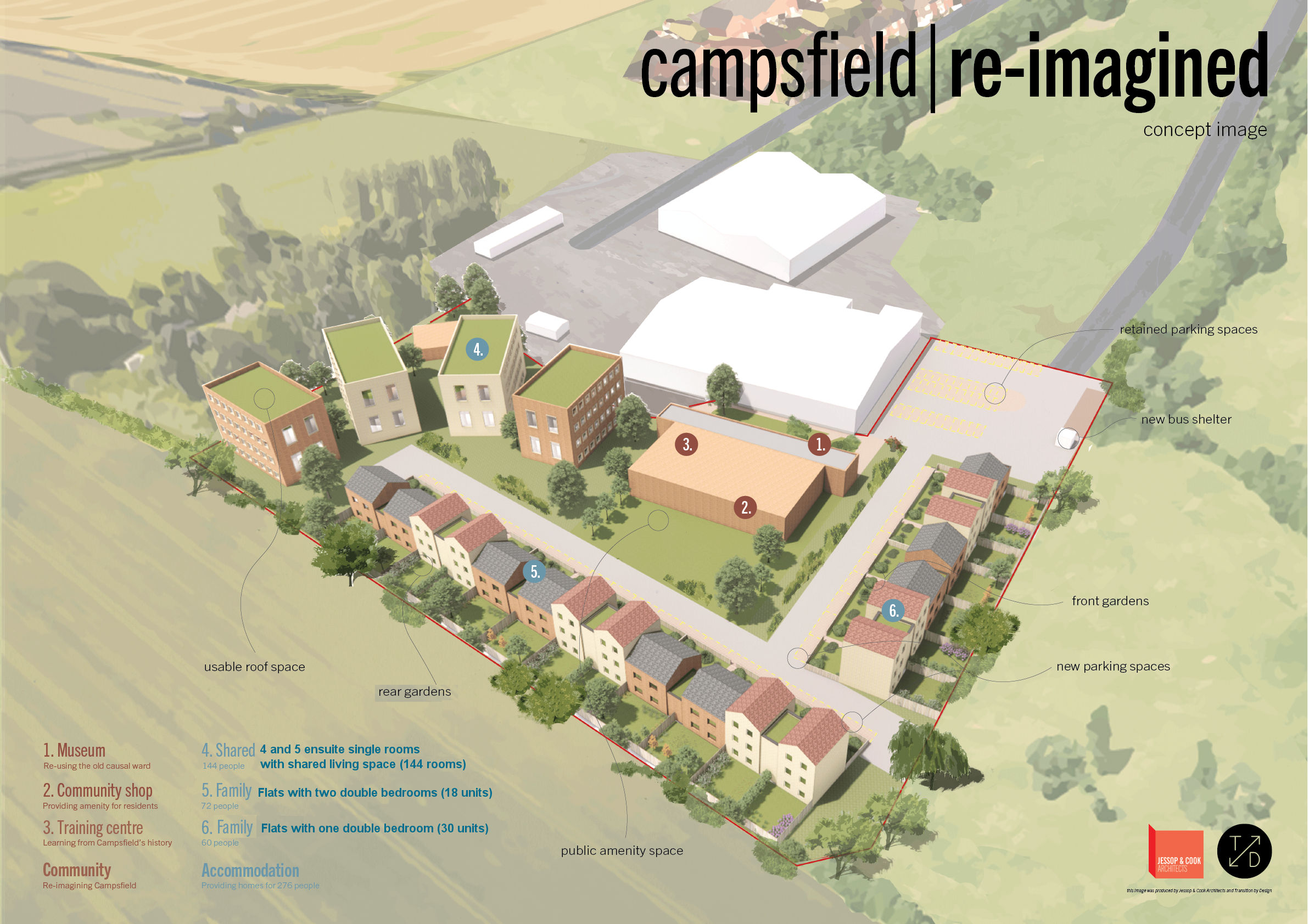 Drawings for the Campsfield Re-imagined development have been produced pro bono through a collaboration between Oxford City of Sanctuary and architects Jessop & Cook and the Transition by Design co-op in Oxford. We are offering a practical and dignified solution for refugee housing.